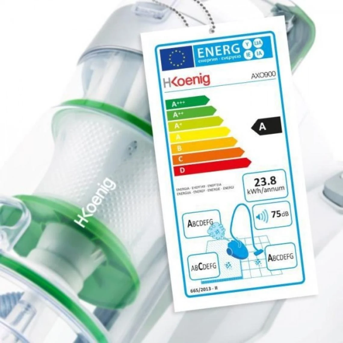 L’aspirateur sans sac AXO900 H.Koenig est classĂ© Triple A par les nouvelles normes Ă©nergĂ©tiques : A : Classe d’efficacitĂ© Ă©nergĂ©tique A : QualitĂ© de filtration A : EfficacitĂ© d’aspiration sur sols durs Grâce a sa technologie silencieuse, le AXO900 se fera tres discret. Sa puissance d’aspiration, son filtre HEPA H12