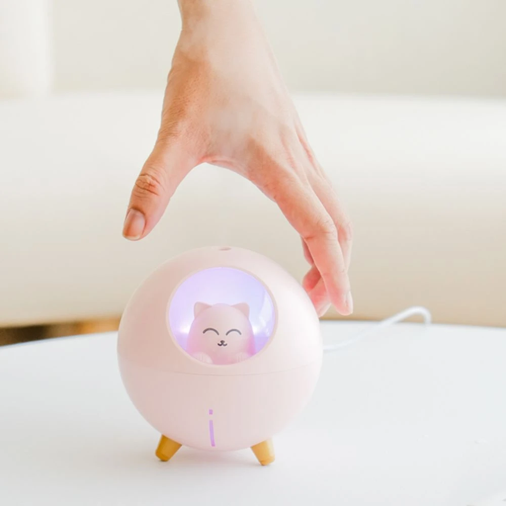 Humidificateur de table à brouillard froid, réservoir d’eau décent (220 ml), brouillard constant (35 ml / h), bruit de travail silencieux ( Belle caractéristique de chat, avec veilleuse, à côté de votre utilisation quotidienne à l’intérieur, la conception de taille portable, une excellente décoration d’ambiance pour votre maison, votre bureau et votre voiture.